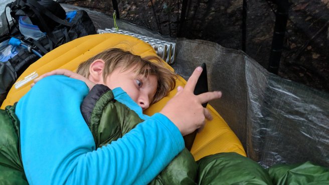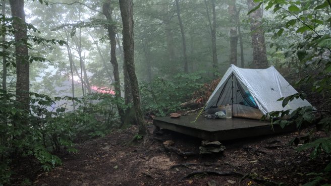 There was an option of camping just below the peak or continuing another five miles to camp on the other side. We chose the earlier stop, happy to be out of the rain before dark.