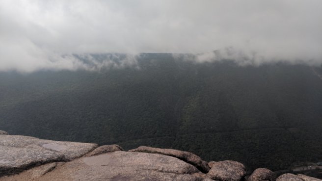 We started hiking today in sunny, clear weather, but on the way up we started to hear thunder in the distance. Soon we were in a fairly intense thunderstorm. The walk up Mt. Webster is mostly within tree cover, so we decided press on. There are, however, about a dozen areas where the trail leaves the trees and proceeds along a ledge above the cliffs for a while. For these exposed areas, we waited until the lightening was out of the area, but we still had to deal with 40 degree temperatures, 50 mph wind and drenching rain. There are not many photos for today because I was mainly focused on dealing with the conditions.