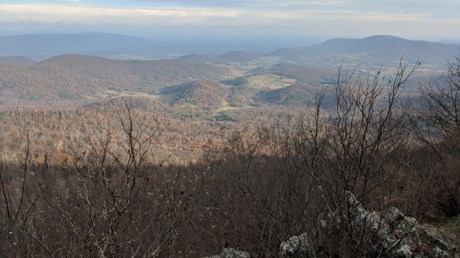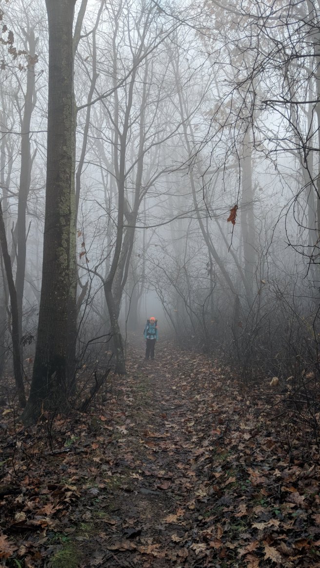 We woke up to dense fog and walked in clouds most of the day. Entering the national park was a definite highlight. There is a kiosk along the trail near the park boundary where we self-registered for our back country permit and then continued into the park. The trail here parallels the Skyline Drive and crosses it frequently, but there was not much traffic today. It felt like we had the park to ourselves.
