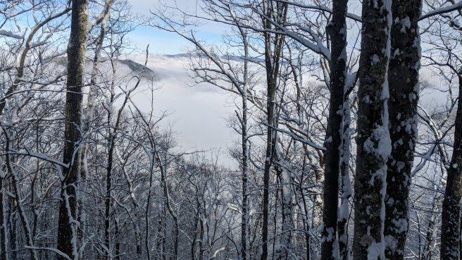 It turned out to be a really nice day for hiking and we enjoyed the short day going over the next peak and even spending a little time above the clouds. However, we did find the snow to be about as deep as we expected. It slows us down and requires more energy to walk, but we are hopeful that it won’t significantly impact our schedule for the next few days.