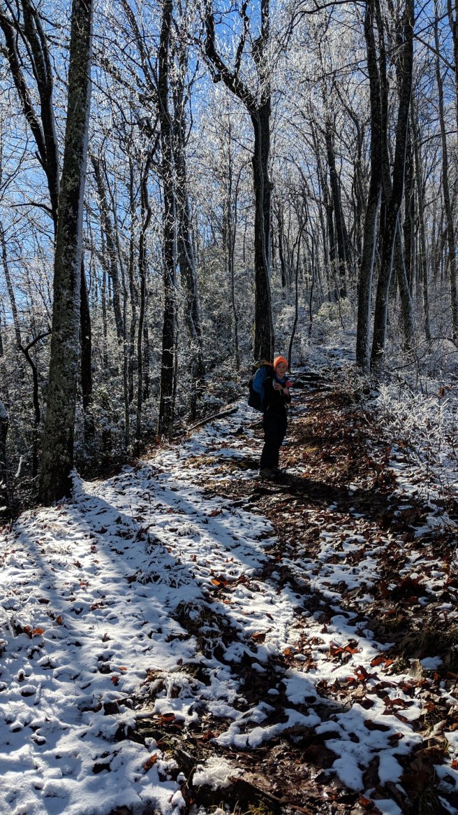 The remnants of the last snow storm are still visible here, but thawing quickly. The clear skies and above freezing temperatures made for perfect hiking weather. Although we’d rather be in the Smokies right now, this was the right choice and we’re happy to be making progress on such a wonderful day.