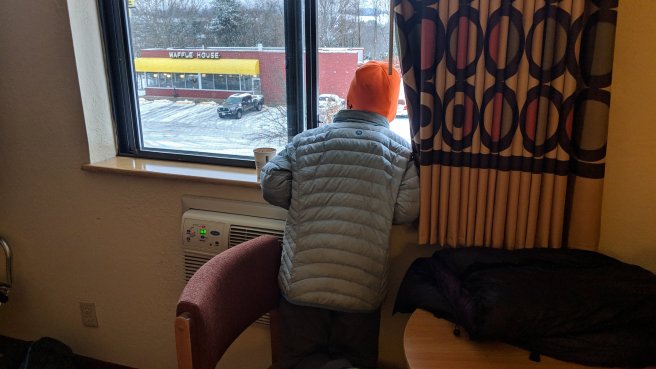 We reached the road to Lexington just as the snow was starting. It is disappointing to have to pause so close to our goal, but this is the right choice. The mountains that we could see in the distance when we arrived in town are now hidden behind walls of falling snow. We’re happy not to be up there right now. This morning there was still a glimmer of hope that we could hike out tomorrow, but the storm is currently predicted to continue for another full day or more. So, we have decided that tomorrow will be a zero.