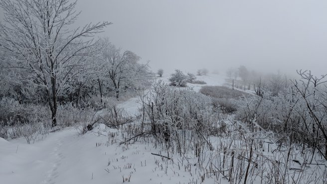 A few days ago we learned that Brenda would be in town for one day, so we took advantage of that and arranged for her to pick us up in the evening. It was slow going with all the snow on the ground, but we were motivated by the prospect of a warm car waiting at the end. So we hiked as fast as we could all day.