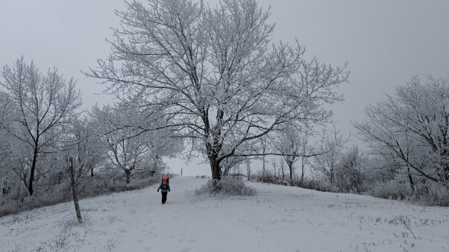 This morning we were both excited to be hiking again and also a bit nervous about our plans for today. Although the snow has stopped falling, there is now quite a bit on the trail, and the weather up on the ridge we are crossing today was very cold. Our original plan was to camp up on the ridge tonight, but we decided to hike farther to the next road crossing instead to avoid being out overnight in the very low temperatures that were predicted up there. That plan set us up for our longest day yet – over 25 miles.