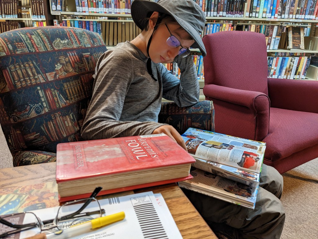 Along the way, we passed a post office and my dad picked up the mail-in ballot he had requested to be sent general delivery to Pine, and voted while I read at the library. I checked out the Guinness book of world records for this year, and found “fastest time to escape from a straightjacket while hanging upside down from a hot air balloon” so I closed the book and found a better one.
