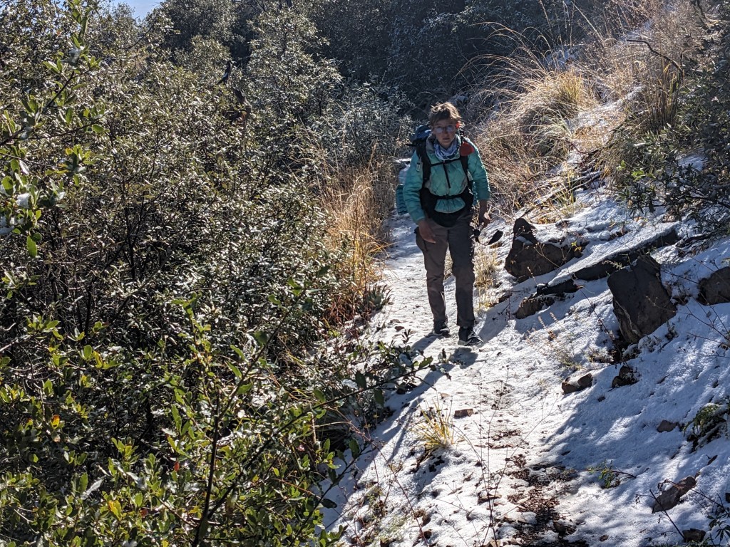 We waited until we could see sun shining on the tent before venturing out this morning. It was cold, but we quickly warmed up as we hiked the rest of the way up Mt. Lemmon. It was a fun hike in the snow and bright sunshine. Along the way we met Bluebird. This is her first thruhike! Her father had worked on the construction of the AZT and always wanted her to hike it. She’s doing it this year to honor that wish.