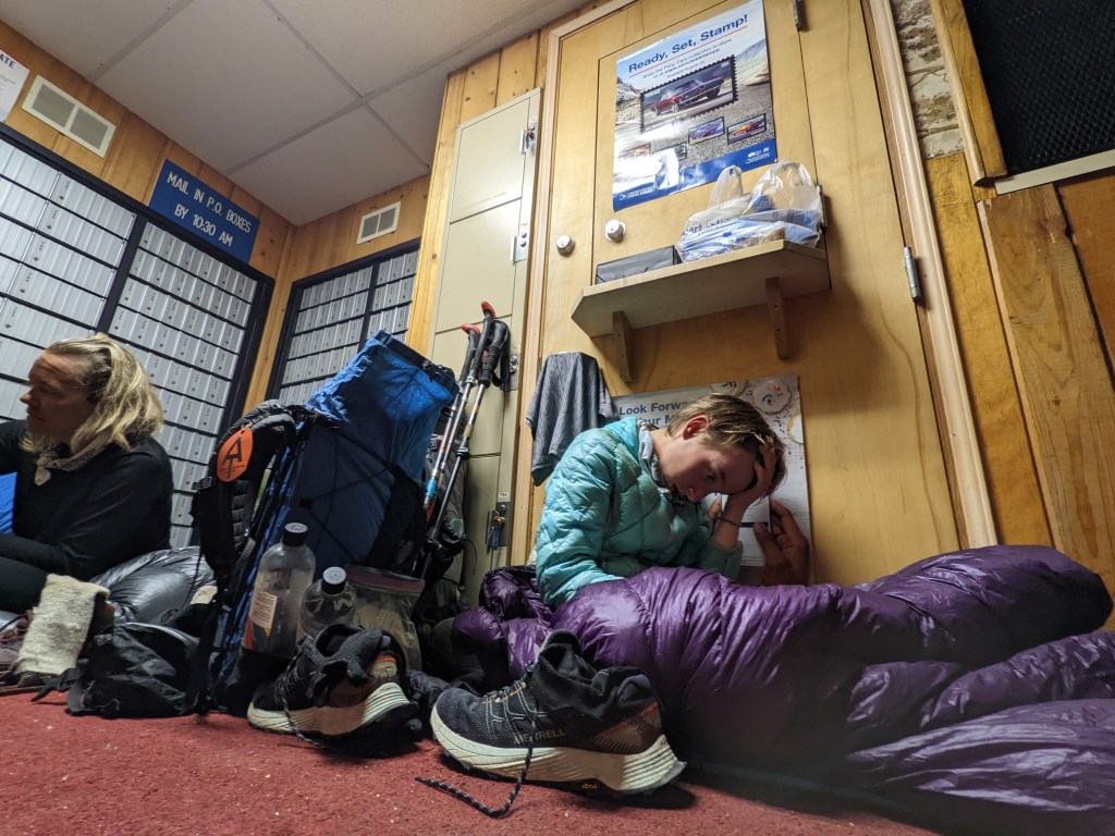 We knew the postal service employee that works there allows hikers to stay as long as they are out early in the morning and leave the place clean; even if some in town don’t love that it happens. We don’t typically plan to sleep in places like this, but when plans change, any legal, warm option on a cold night is fair game.