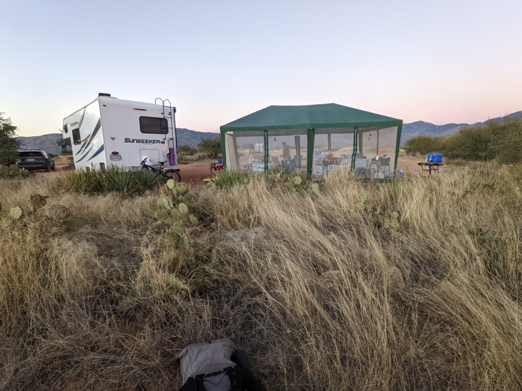 When we arrived, we met Jim And Deborah, local trail angels who are just amazing people. They have been doing this for a few years. They set up a campsite out here with lots of drinks and snacks and comfy chairs. In the evening they cook dinner and then in the morning they make a pancake breakfast and provide rides to a grocery store. We set up nearby and had a wonderful evening! It was exactly what we needed in this long stretch between towns.