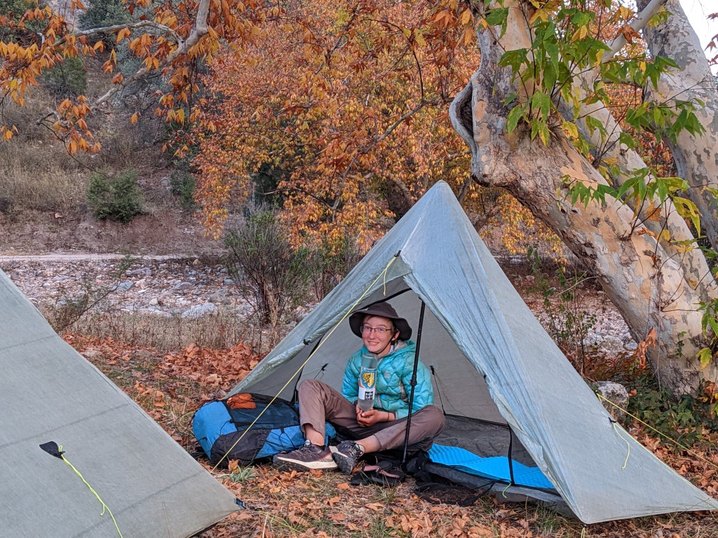 We’re planning a short day tomorrow into town, so it doesn’t matter too much where we stop this evening. When we spotted an area with trees near a stream, we thought it seemed inviting so we set up there for the night.