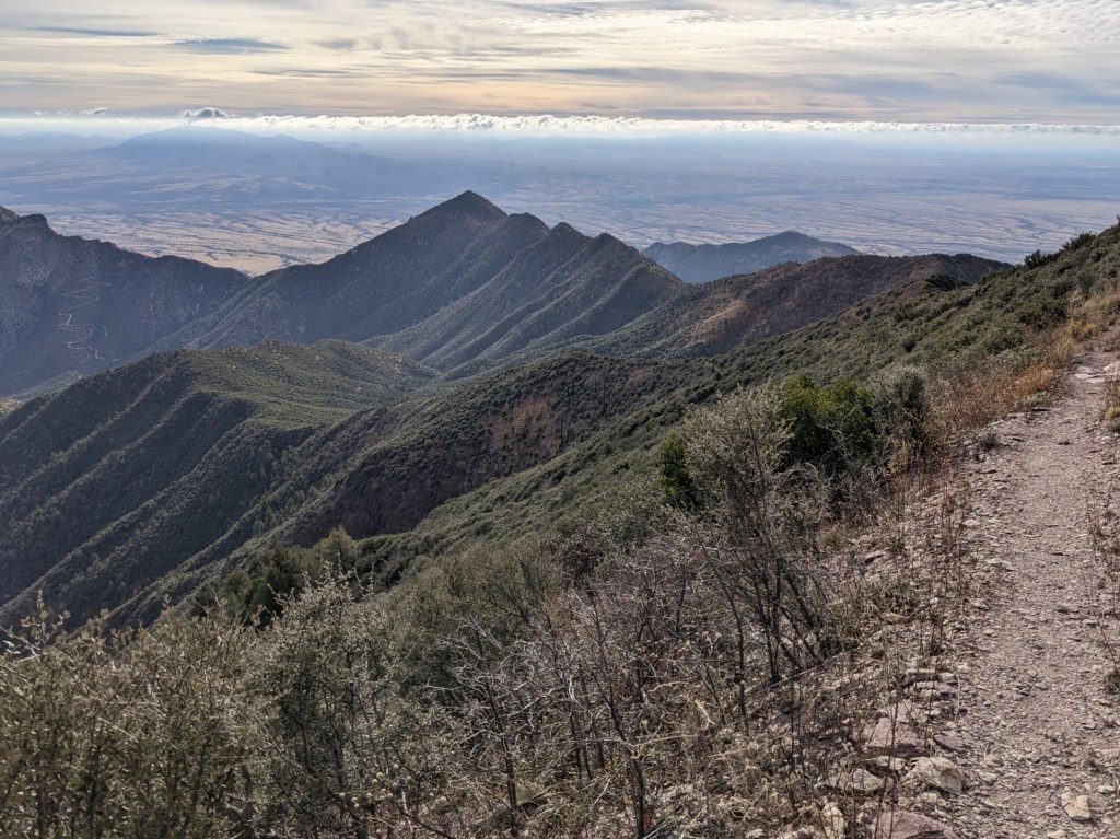 We reach the top of the mountain at around 10. 3000 feet up done so far, all down to the border from here. The sun is finally warming our faces.