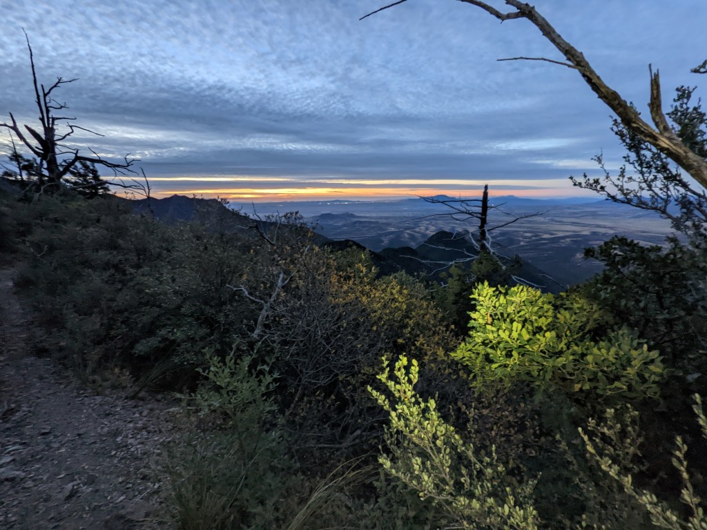 I struggle to remove my sleeping bag and put on damp, cold socks. I manage. We pack up in 30 minutes, awake and ready to hike. Or maybe just ready to warm up. Backpacks and headlamps on, legs ready to go. 5 am.