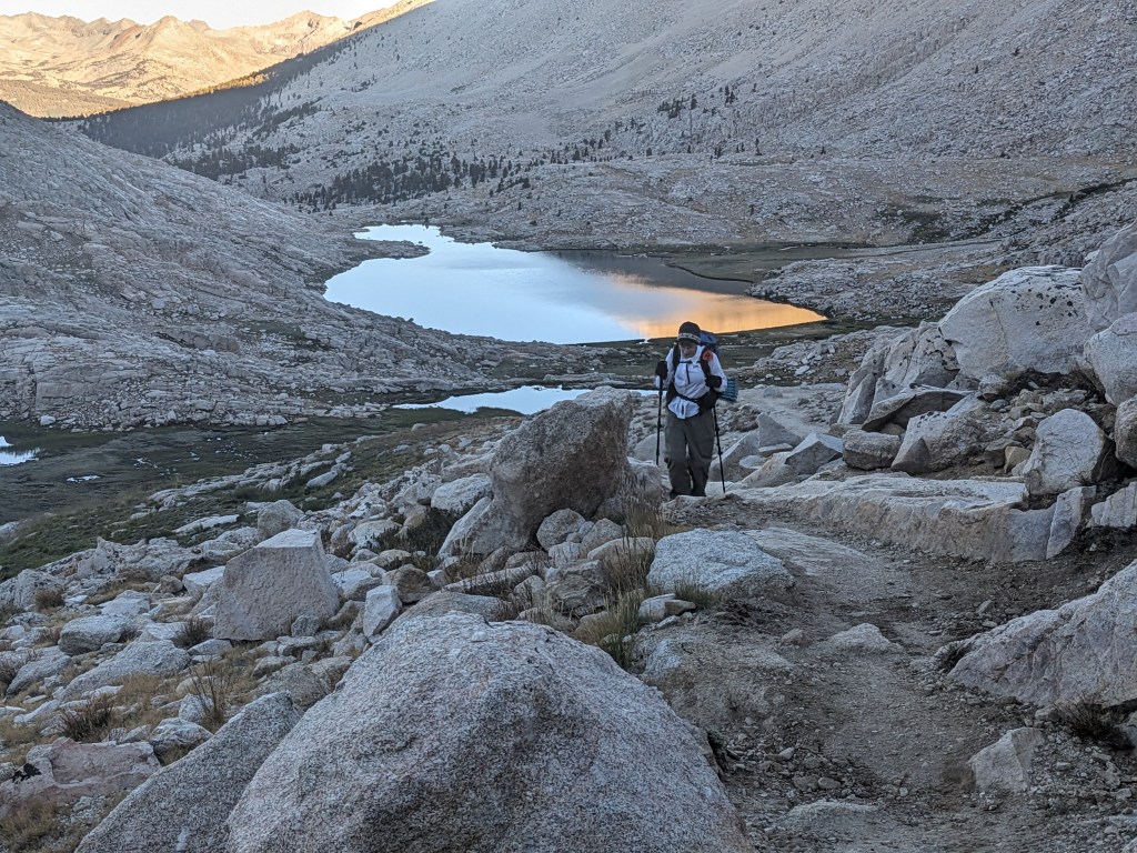 Our morning started fairly early in order to race the sunrise. The exposed Sierra afternoon sun can be the difference between hiking at 3 mph and hiking at 1 mph. We kept looking back at the lake as it got farther and farther away and more and more illuminated. The view was in startling contrast to our average days on the AT, which were heavily wooded.