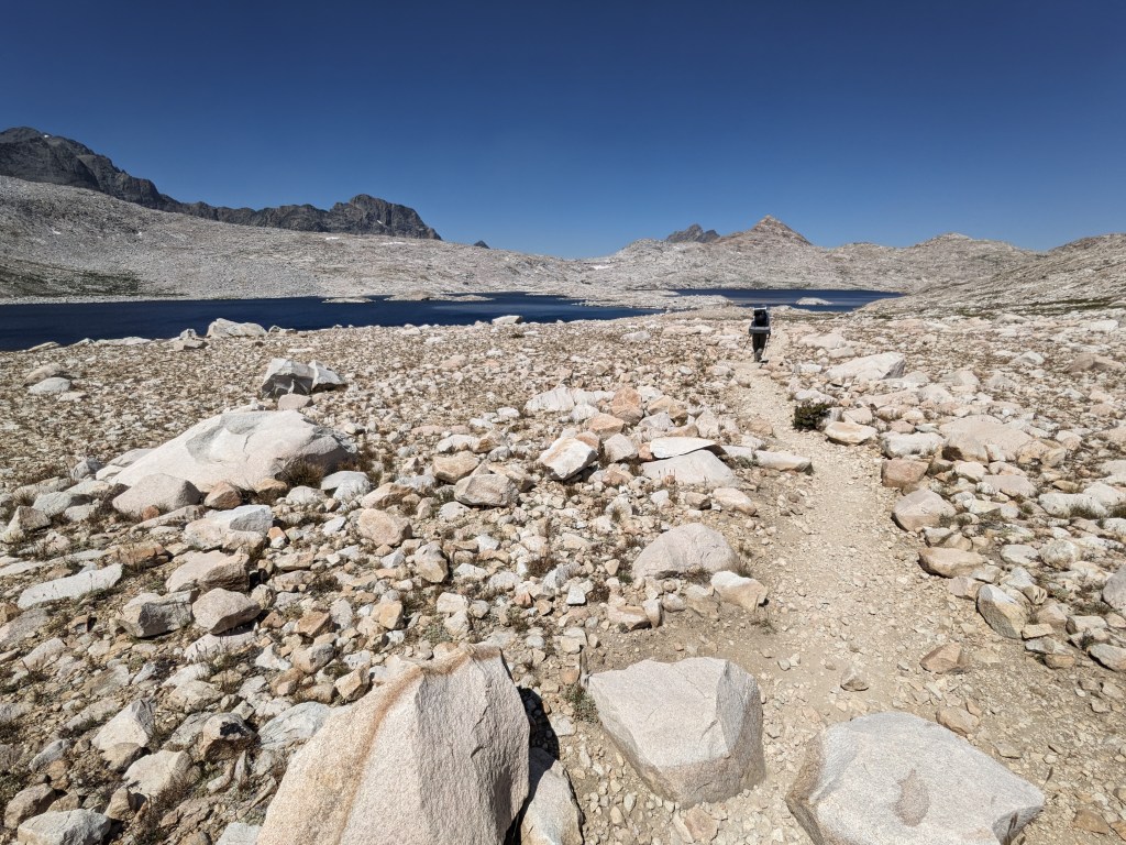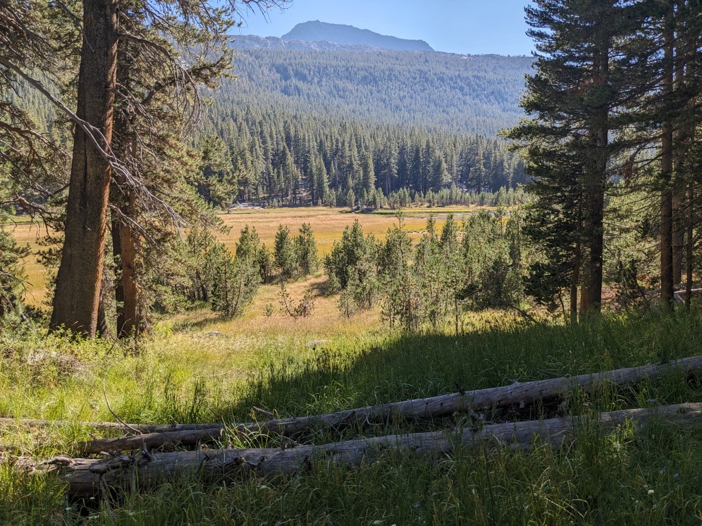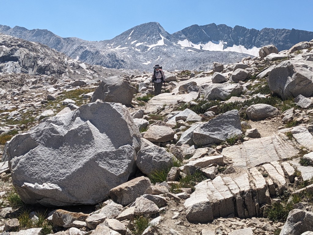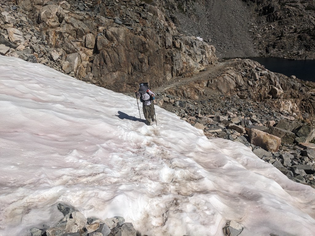 We had heard that there was no snow left on the trail, but, today we found this small section. Somehow seeing this sort-of high angle slope here helped put into perspective how different this trail would be early in the season when this whole area would still be covered.