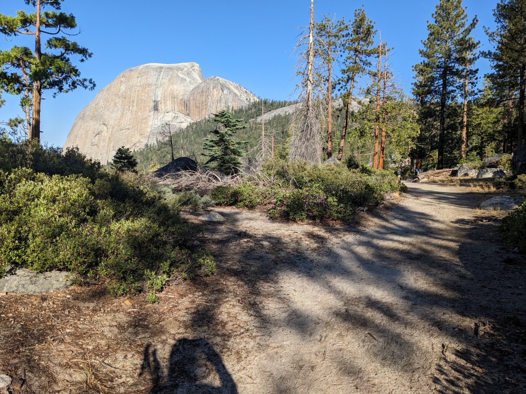 Our hike into the valley was incredibly scenic, as expected from Yosemite. Nevada Fall (yes, it’s singular) features in this image. At this point we started running into a few day-hikers. About an hour later the crowds were almost unbearable. We were moving aside for somebody on nearly every switchback. The trail became paved for the last mile or so, which was somehow more painful to walk on than solid granite.